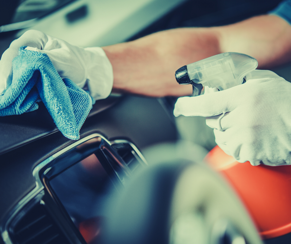 Use a soft brush or air duster for air vents. Wipe down frequently touched areas like the steering wheel, gear stick, and handles with an antibacterial product.